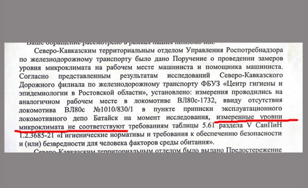 «Преследование машиниста началось с того, что не принял локомотив в жару: на улице + 42, в кабине 65 градусов. Отказался явиться на явку в свой выходной день. Нарушения температуры на рабочем месте машиниста зафиксировано проверкой РОСПОТРЕБНАДЗОРА. Локомотивы процентов 98 нет кондиционеров. Ответ прилагаю».