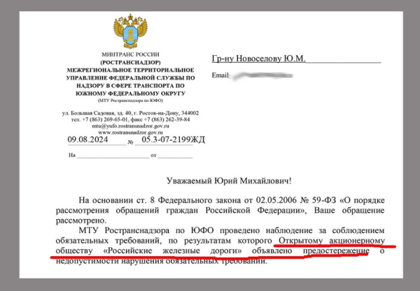 Председатель первички МПЖ в своей деятельности по защите прав работников не ограничивается письмом в СМИ. Юрий Михайлович приложил несколько своих обращений и ответов на них — от Ространснадзора («ОАО «РЖД» объявлено предостережение»), от Северо-Кавказской дирекции тяги («зам по эксплуатации освобождён от должности»).