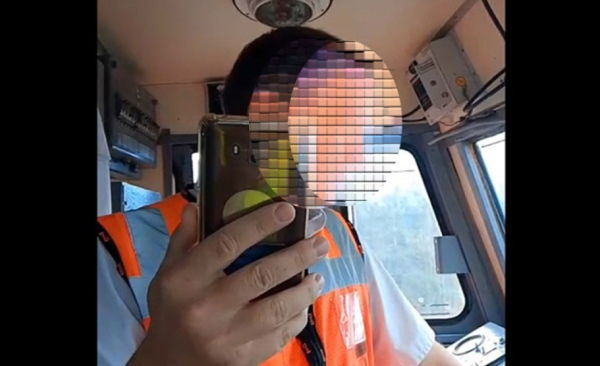 На одном из видео человек в форменной рубашке РЖД, находясь в кабине электровоза, снимает мобильным телефоном, направленным на рабочее место машиниста. Его самого снимают с места машиниста.